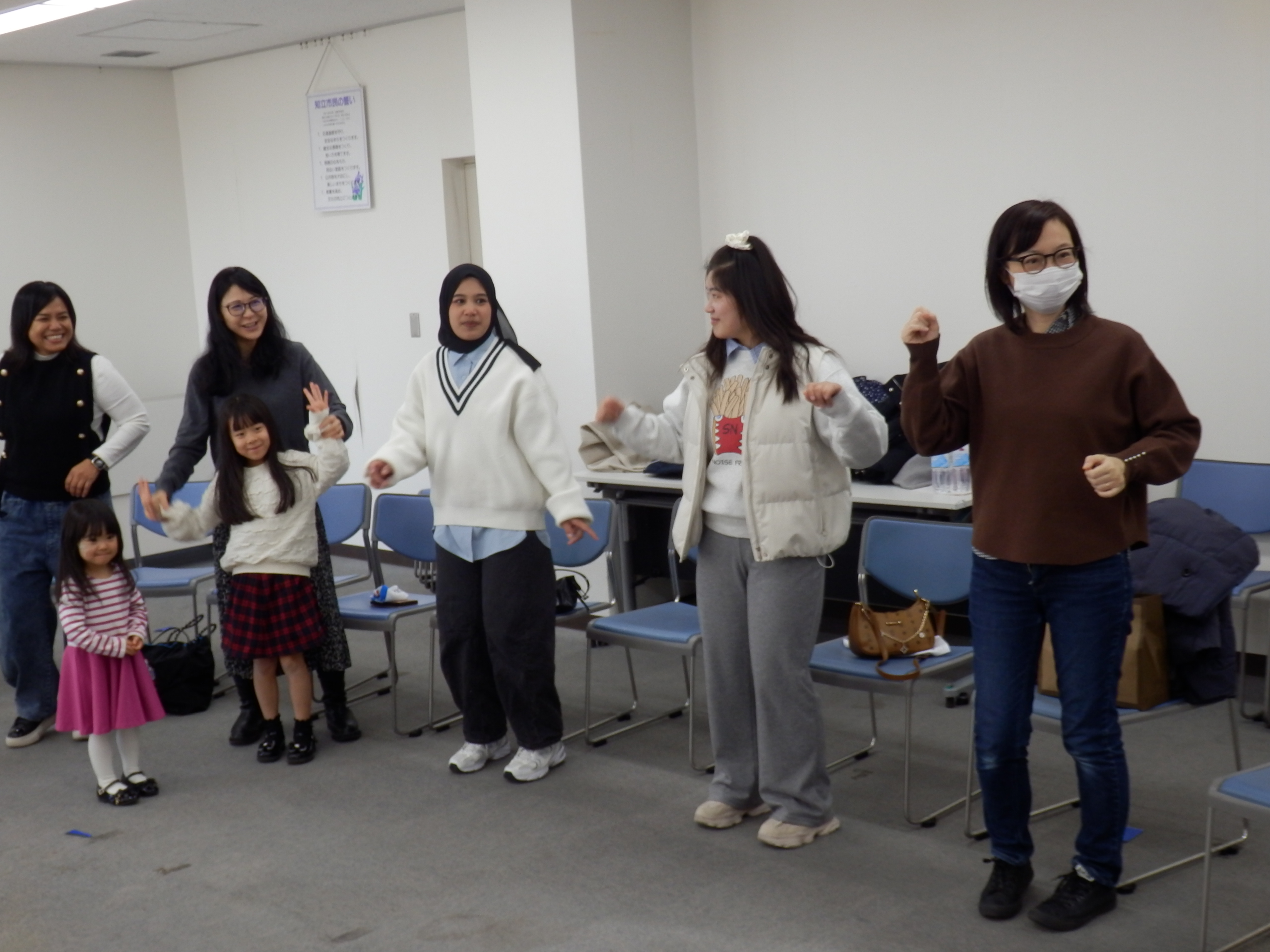 外国人6人、ホストファミリー5家族の参加。10時から公民館で対面式と交流会。 TikTokで流行っているインドネシアの手遊び、子どもたちとミッキーのダンスや、ジングルベルの歌で輪になってみんなでダンスを楽しみました。その後それぞれの家に行き、日本の家庭を体験しました。